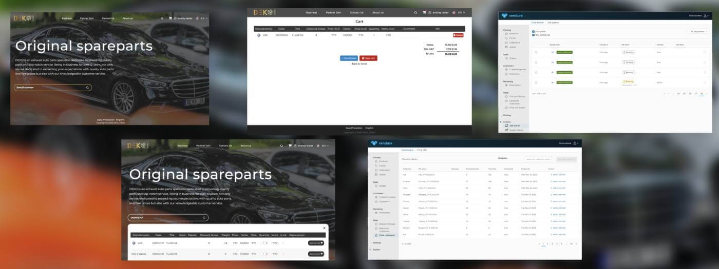 Projekt stanowił ogromną nierozwiązywalną łamigłówkę, którą podzieliliśmy na mniejsze zadania, priorytetyzowaliśmy i stopniowo rozwiązywaliśmy. Wybraliśmy platformę Vendure.io, ponieważ to nowoczesna bezgłowa struktura do szybkiego tworzenia sklepów internetowych z możliwością rozwijania niestandardowego interfejsu użytkownika i rozszerzania istniejącej funkcjonalności przy użyciu Node.js i GQL. Następnie przearanżowaliśmy bazy danych: połączyliśmy je, przekształciliśmy format danych, wykluczyliśmy duplikaty i usunęliśmy uszkodzone dane, przenieśliśmy do Postgre. MVP zostało miękkie uruchomione, a stara wersja tymczasowo działała równolegle w celach beta-testowania. Kolejnym wyzwaniem było zbudowanie bogatszej funkcjonalności i zaktualizowanie bazy danych nowymi danymi – producenci, części, cenniki, schematy rabatowe. Nowa funkcjonalność obejmowała system rabatowy, obsługę wielojęzyczną, importowanie cen i automatyzację eksportu zamówień. Najtrudniejszym zadaniem było odtworzenie systemu rabatowego i rozwinięcie automatyzacji cennika. Te same części samochodowe są produkowane w różnych fabrykach i miejscach, mogą mieć w pełni zamienne odpowiedniki innych marek, a każdy producent oferuje kumulacyjne zakresy rabatów, które zależą od ilości zakupionych przedmiotów przez firmę na stałe. Zanim zaczęliśmy budować tę funkcjonalność, zebraliśmy wszystkie wymagania, aby mieć pewność, że wszyscy mówimy o tym samym. Jeśli chodzi o automatyzację importu, co 3 miesiące Klient otrzymuje pliki z aktualnymi produktami i nowymi cenami od dostawców. Pliki te zawierają miliony wierszy, i konieczne było sparsowanie ich przy użyciu wielowątkowości i kolejek, a następnie skuteczne zaktualizowanie katalogu produktów, obsługa błędów przetwarzania i skrócenie czasów aktualizacji. Po załadowaniu danych katalog produktów wzrósł do 10 milionów unikalnych części, co spowodowało poważny spadek wydajności. Przeprowadziliśmy sesje testów obciążeniowych, optymalizując logikę biznesową, strukturę bazy danych, indeksy, zapytania SQL, API, schematy GQL, interfejs użytkownika, skrypty, infrastrukturę. Po 3 tygodniach skrupulatnej pracy osiągnęliśmy pożądane rezultaty. Teraz nowa witryna całkowicie zastąpiła starszą wersję.