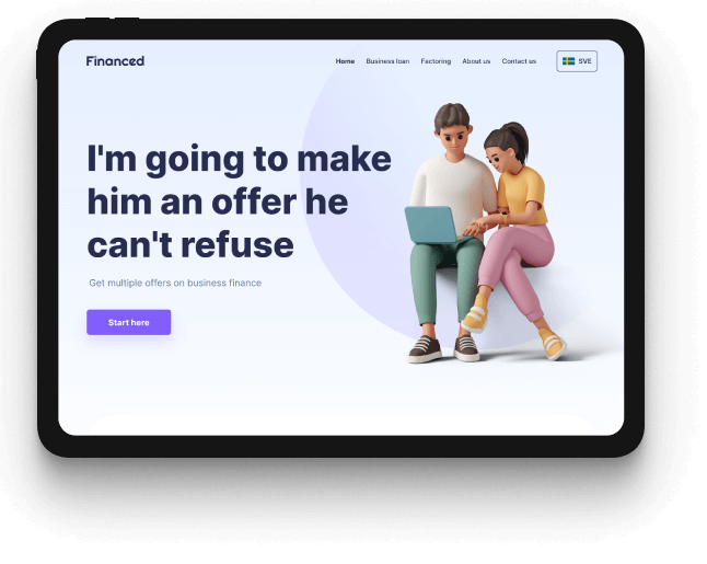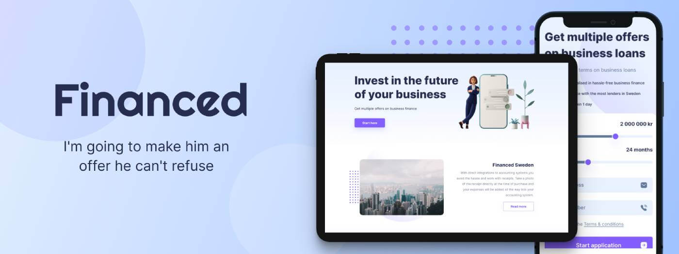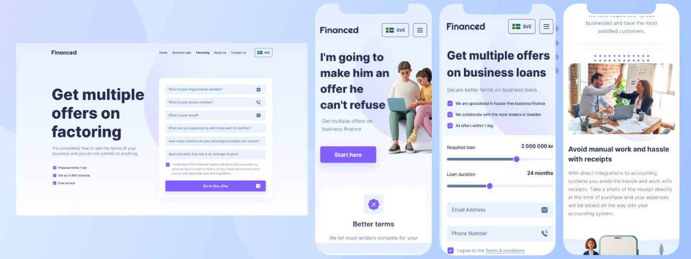 Ми розробили фінансову платформу з нуля, щоб власники бізнесу могли негайно отримати професійне обслуговування. Шведські підприємці можуть отримувати оплату безпосередньо з факторингу і задовольняти свої потреби в бізнес-кредитах протягом 24 годин. Щоб гарантувати безпеку укладання угод, сервіс має ідентифікацію BankID із зазначенням реєстраційного номера компанії. Наша команда також виконала вимоги Клієнта та успішно інтегрувала AROS API та Sendgrid у продукт. Інтуїтивно зрозуміла панель адміністратора відповідає всім бізнес-потребам клієнта. Привабливий, естетичний та індивідуальний дизайн веб-сайту допомагає ефективно залучати відвідувачів. Сайт ідеально підходить для настільних комп’ютерів, планшетів і смартфонів.